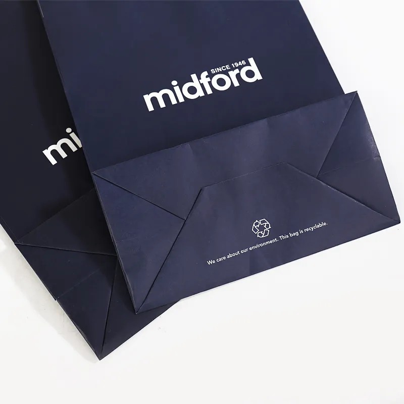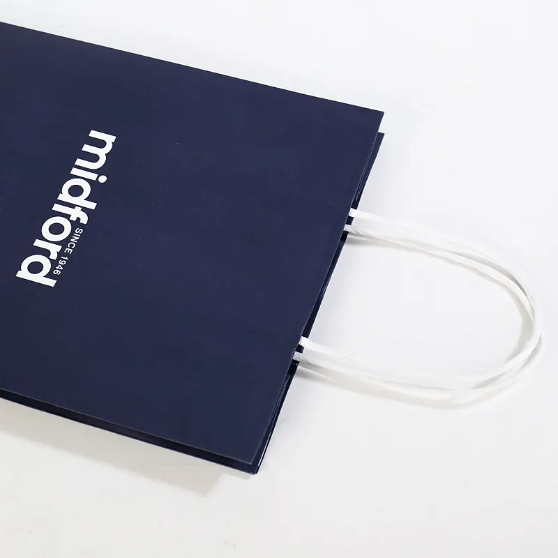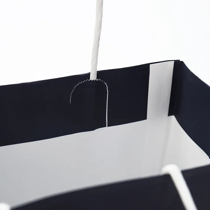 Turnover Top paper bag the top is a turnover top, strong and not easy to slit. Turn-top bags are high quality, beautiful outside, and elegant. Twisted handle, flat handle, nylon rope handle, or cotton handle available, and customized colors are available too. They are very strong and durable, load-bearing up to 5kg